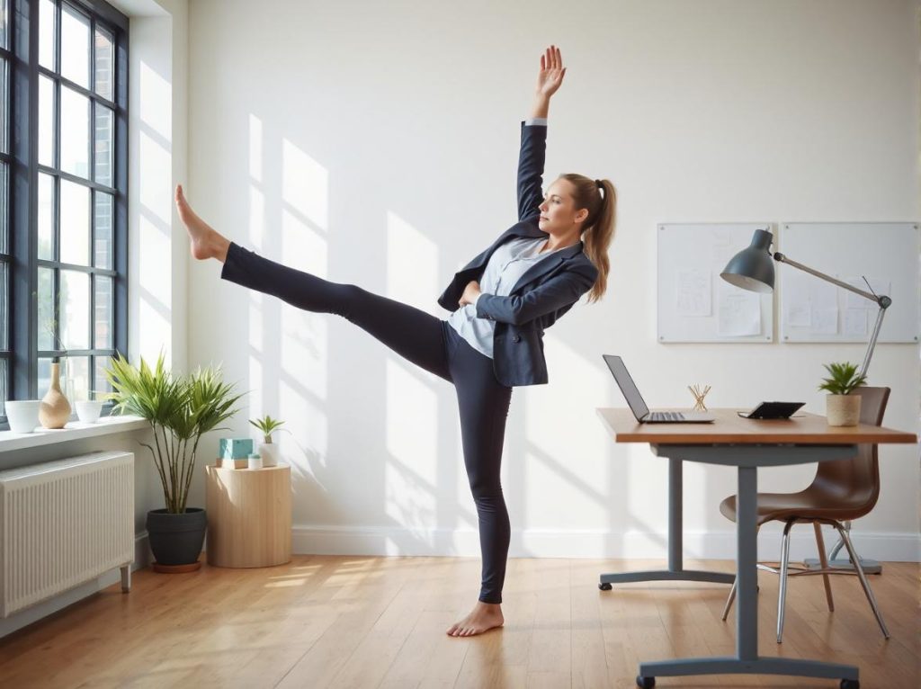 Standing exercises are perfect for breaking up long sitting periods. Simple movements, such as leg lifts, standing calf raises, or light dancing while standing, help keep your blood flowing and prevent stiffness. Standing up and moving every 30 to 60 minutes can significantly reduce the negative effects of prolonged sitting.
